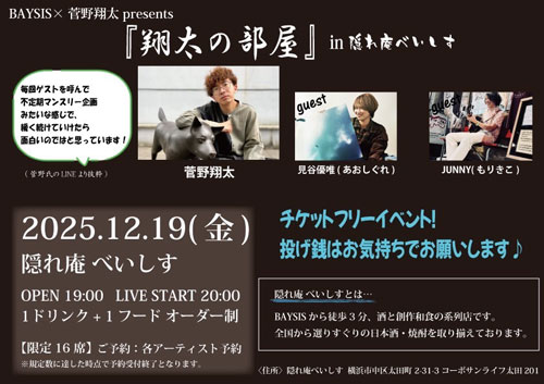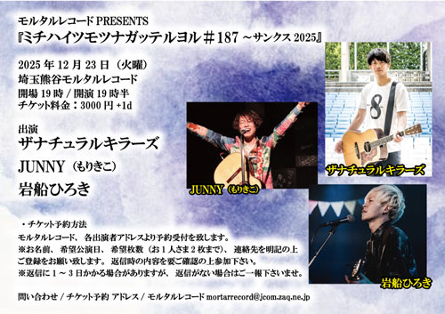 | 【ソロLIVE】 pick up!! ☆12月14日(日)昼 東京・幡ヶ谷 36°5 ぬまのカズシ×JUNNY 『季節外れの灼熱レコ発2MAN!!』 開場 12:00 開演 13:00 チャージ¥3,000(1drink別) 【共演】 ぬまのカズシ 【問い合わせ】 Acoustic Live Bar 幡ヶ谷 36°5 TEL 03-5351-3605 〒151-0072 東京都渋谷区幡ヶ谷2-13-1 平沼ビル2F https://www.hatagaya365.com/ ![]() ◇12月19日(金)神奈川・関内隠れ庵BAYSIS BAYSIS×菅野翔太 presents『翔太の部屋』 開場19:00 開演20:00 1ドリンク+1フードオーダー制 【共演】 菅野翔太、見谷優唯(あおしぐれ) 【問い合わせ】 隠れ庵べいしす 神奈川県横浜市中区太田町2-31-3 コーポサンライフ太田201 ![]() new ◇12月23日(火)埼玉・熊谷MORTAR RECORD モルタルレコードPRESENTS 『ミチハイツモツナガッテルヨル#187~サンクス2025』 開場 19:00 開演 19:30 チャージ¥3,000(1drink別) 【共演】 THE NATURALKILLERS、岩船ひろき 【問い合わせ】 MORTAR RECORD TEL 048-526-6869 〒360-0037 埼玉県熊谷市筑波 1-165 https://mortar-record.com/ ![]() ▲▲チケット予約は、「公演日」「フルネーム」「枚数」を記載の上、こちらまでメール頂くか、 または 公式LINE→ https://lin.ee/erZ4fyC まで |